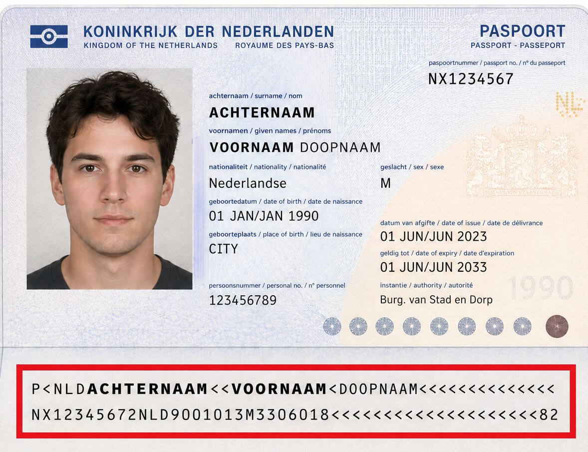 *De Machine Readable Zone wordt weergegeven als P < LANDCODE ACHTERNAAM << VOORNAAM < OVERIGE < NAMEN. Alleen het veld achternaam en voornaam is vereist op het ticket om te kunnen reizen.